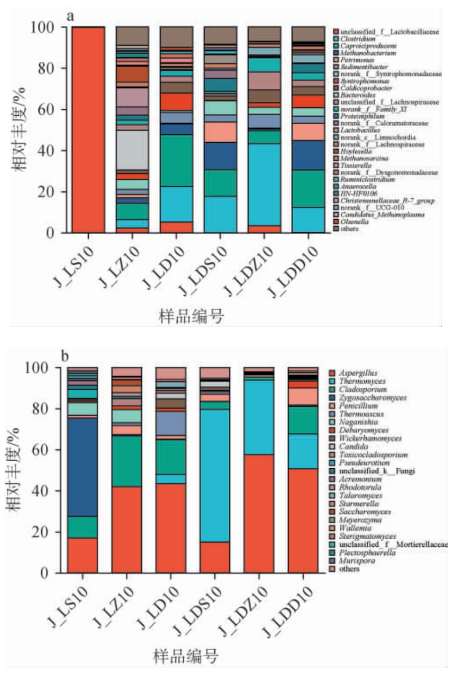 由图4a可知,从两酒厂窖泥样品中共注释到21个细菌门。J-L酒厂窖泥样品中共注释到14个细菌门,包括3个优势细菌门(平均相对丰度≥1%),分别为厚壁菌门(Firmicutes)(82.85%)、拟杆菌门(Bacteroidota)(12.79%)、甲烷杆菌门(Methanobacteriota)(2.61%)。J-LD酒厂窖泥样品中共注释到18个细菌门,包括4个优势细菌门,分别为Firmicutes(76.06%)、Bacteroidota(11.43%)、Methanobacteriota(9.45%)、盐杆菌门(Halobacteriota)(1.98%)。两个酒厂窖泥中共有的优势细菌门有3个,其中Firmicutes在不同酒厂不同位置都占主导地位,Firmicutes通过产香产酸、维持微生态及促进窖泥老熟等对浓香型白酒品质起关键作用[31]。