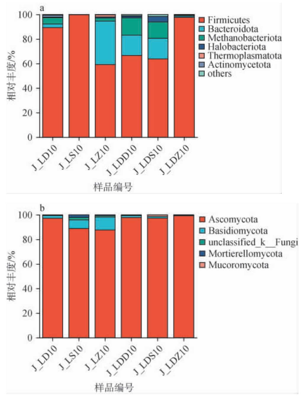 图4 基于门水平泸州地区不同酒厂窖泥样品中细菌(a)和真菌(b)菌群结构