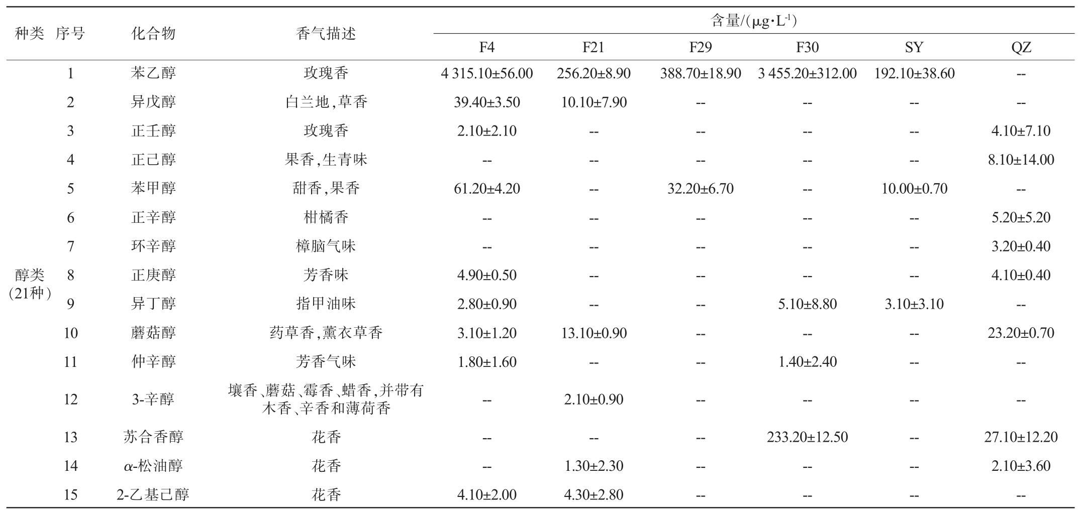 种类 序号化合物香气描述醇类(21种)1234567891 0 11 12 13 14 15苯乙醇异戊醇正壬醇正己醇苯甲醇正辛醇环辛醇正庚醇异丁醇蘑菇醇仲辛醇3-辛醇苏合香醇α-松油醇2-乙基己醇玫瑰香白兰地,草香玫瑰香果香,生青味甜香,果香柑橘香樟脑气味芳香味指甲油味药草香,薰衣草香芳香气味壤香、蘑菇、霉香、蜡香,并带有木香、辛香和薄荷香花香花香花香含量/(μg·L-1)F4F21F29F30SYQZ 4 315.10±56.00 39.40±3.50 2.10±2.10--61.20±4.20----4.90±0.50 2.80±0.90 3.10±1.20 1.80±1.60------4.10±2.00 256.20±8.90 10.10±7.90--------------13.10±0.90--2.10±0.90--1.30±2.30 4.30±2.80 388.70±18.90------32.20±6.70--------------------3 455.20±312.00--------------5.10±8.80--1.40±2.40--233.20±12.50----192.10±38.60------10.00±0.70------3.10±3.10----------------4.10±7.10 8.10±14.00--5.20±5.20 3.20±0.40 4.10±0.40--23.20±0.70----27.10±12.20 2.10±3.60--