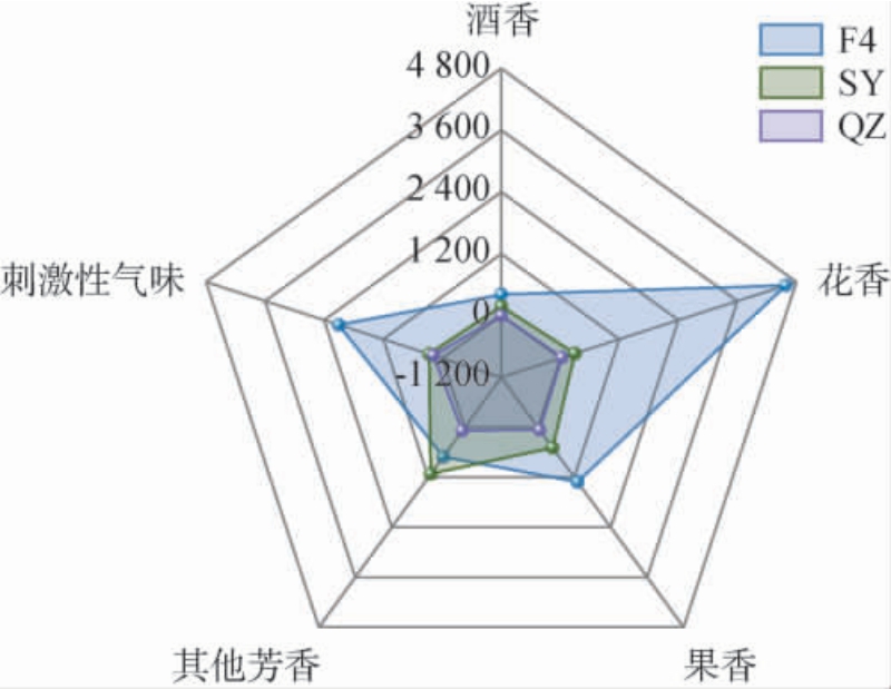 为了更直观、系统地比较菌株F4红枣发酵液与红枣清汁、菌株SY红枣发酵液的香气差异,进一步依据检出的香味物质成分的含量,对菌株F4红枣发酵液、菌株SY红枣发酵液和红枣清汁的香气进行划分,并以各类香气的含量绘制风味轮廓雷达图,结果见图1。由图1可知,与红枣清汁及菌株SY红枣发酵液相比,菌株F4红枣发酵液的各类香气均有明显增强,尤其增强了花香风味,果香和刺激性气味也有明显增强。