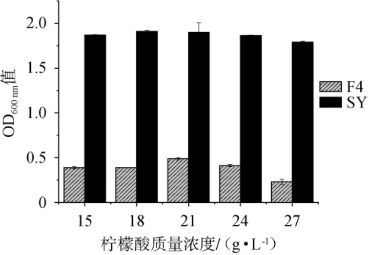 图5 不同柠檬酸质量浓度对库德里阿兹威毕赤酵母F4和菌株SY生长的影响