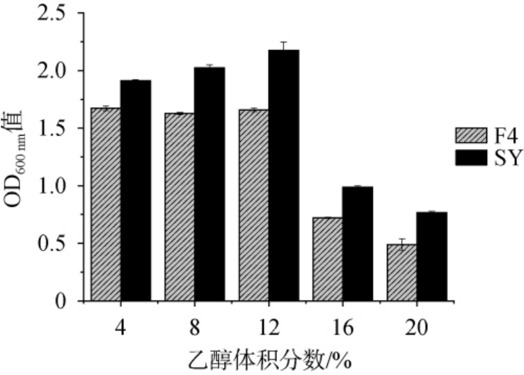 乙醇是酵母菌发酵产生的主要副产物,浓度过高会胁迫酵母菌的生长[30]。因此,考察库德里阿兹威毕赤酵母F4和菌株SY的乙醇耐受性,结果见图4。