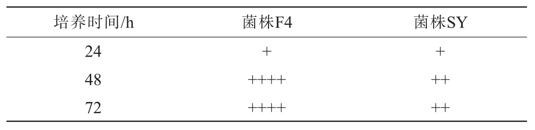 培养时间/h菌株F4菌株SY 24 48 72++++++++++++++
