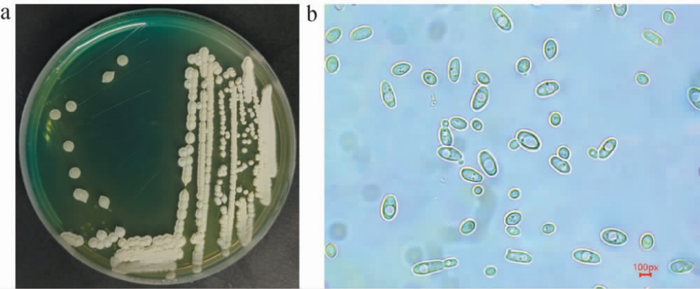 Fig. 2 Colony (a) and cell (b) morphology of excellent aromaproducing yeast F4