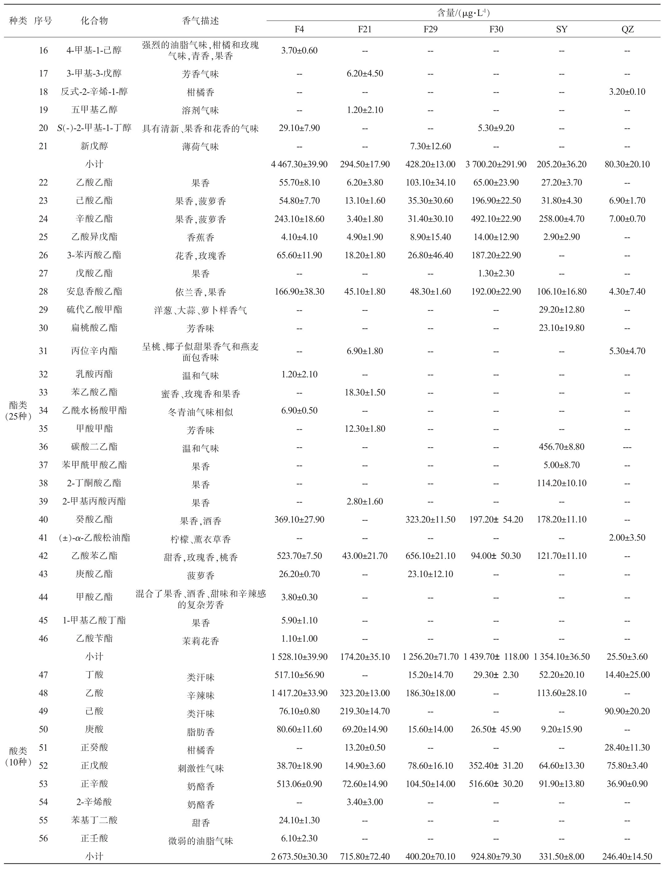 醛酮类(13种)种类 序号化合物香气描述57 58 59 60 61 62 63 64 65 66 67 68 69玫瑰香舒适气味刺激性气味杏仁香蕉香果香、青香、蜡香、蔬菜香、蘑菇香、干酪香果香椰子香玫瑰香辛辣味苦杏仁香杏仁和山楂花香气风信子香奶油香酚类(2种)70 71大马酮环丁酮羟乙醛糠醛3-辛酮正辛醛椰子醛大马士酮乙缩醛苯甲醛苯乙酮苯乙醛3-羟基-2-丁酮小计对甲酚2,4-二叔丁基酚酚类物质总和总和芳香气味刺激性气味含量/(μg·L-1)F4F21F29F30SYQZ 35.40±1.90 54.80±2.00--------9.40±1.00----42.10±1.10 2.00±1.10----143.70±1.20--565.40±22.80 565.40±22.80 9 378.00±13.80--9.40±5.00--------7.90±1.60 19.40±2.00--12.10±3.40 2.30±0.90----51.10±7.90--606.70±23.80 606.70±23.80 1 797.70±122.20--------------63.30±8.80------2.30±4.00 29.40±5.50 95.00±5.10------2 179.60±113.30------------------------------498.90±19.90 498.90±19.90 6 563.60±178.20----5.40±4.90----------3.10±5.40 53.60±53.60------62.10±54.40--778.80±101.30 778.80±101.30 2 731.70±49.50------4.30±4.20 2.10±1.20 1.20±1.20------14.20±6.60------21.80±1.00 1.20±2.10 565.70±12.80 566.90±12.80 940.90±29.00
