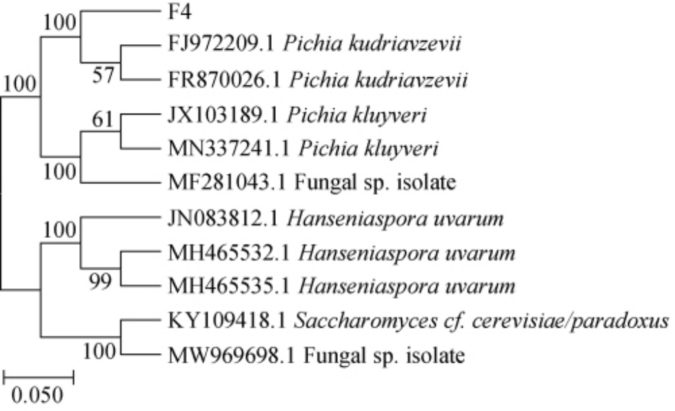 基于26S rDNA D1/D2区基因序列,构建菌株F4的系统发育树,结果见图3。由图3可知,菌株F4与库德里阿兹威毕赤酵母(Pichia kudriavzevii)聚于一支,亲缘关系最近,相似度为100%,结合形态学特征,最终鉴定菌株F4为库德里阿兹威毕赤酵母(Pichia kudriavzevii)。