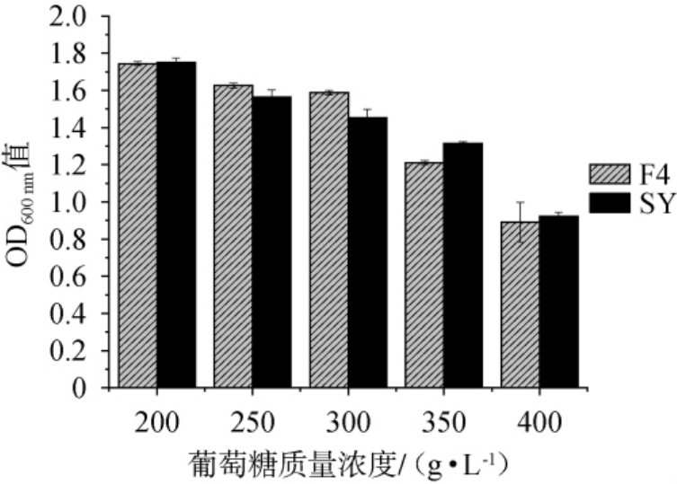 由图6可知,随着葡萄糖质量浓度的升高,菌株F4和SY的OD600nm值均呈下降趋势,说明两株菌的生长均受到明显抑制,但均可在葡萄糖质量浓度400 g/L的条件下生长。此外,不同葡萄糖质量浓度条件下,菌株SY的OD600 nm值均高于菌株F4,说明菌株F4对葡萄糖的耐受性弱于菌株SY,这与葛佳伟等[33]的研究结果一致。