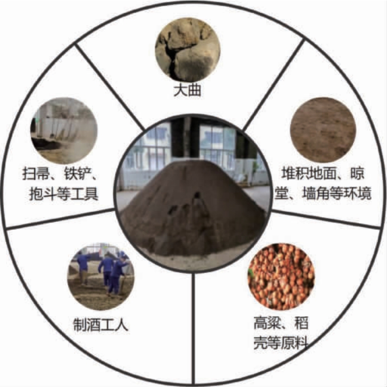 酱香型白酒的酿造高度依赖高温堆积发酵这一核心环节。 在此过程中,通过创造特定的温度、湿度条件,能够高效富集并整合来自原辅料、生产器具表面、空气介质以及周边环境中的各类微生物资源。 研究表明,堆积发酵体系的细菌类群主要来源于大曲,并通过空气等介质定植于工具表面;而酵母菌群则通过场地内散落的谷物原料、曲粉颗粒及糖类物质实现快速增殖,经工人翻拌等操作被裹挟进入酒醅,并在堆积发酵状态下实现扩增[7]。酱香型白酒堆积发酵过程微生物群落来源见图1。