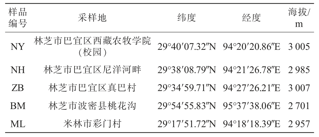 样品编号采样地纬度经度海拔/m NY NH ZB BM ML林芝市巴宜区西藏农牧学院(校园)林芝市巴宜区尼洋河畔林芝市巴宜区真巴村林芝市波密县桃花沟米林市彩门村29°40′07.32″N 29°38′08.79″N 29°34′59.71″N 29°54′55.83″N 29°17′51.72″N 94°20′20.86″E 94°21′26.78″E 94°27′26.21″E 95°37′38.06″E 94°18′18.39″E 3 005 2 985 3 007 2 701 2 957
