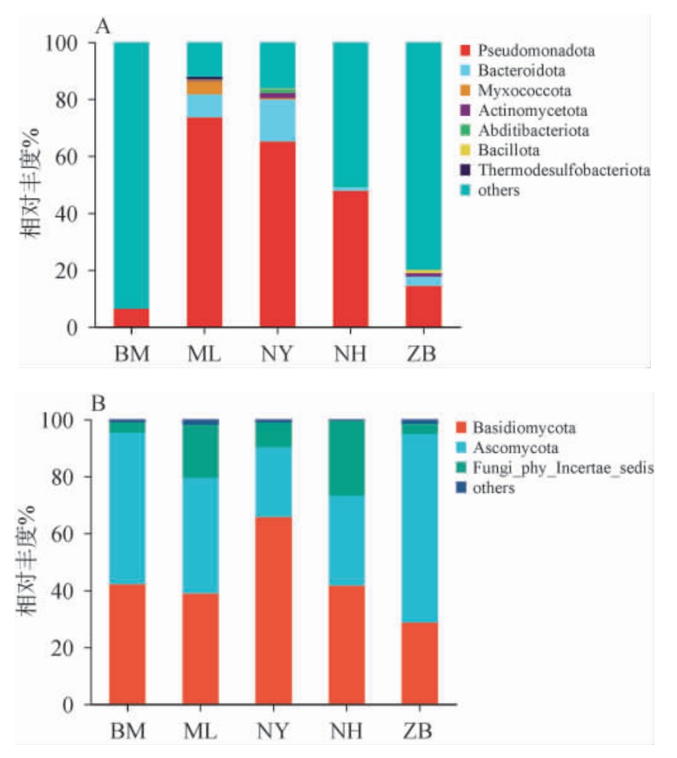 Fig. 2 Community structure composition of bacteria (A) and fungi (B)in Prunus mira fruit samples from different production areas based on phylum level