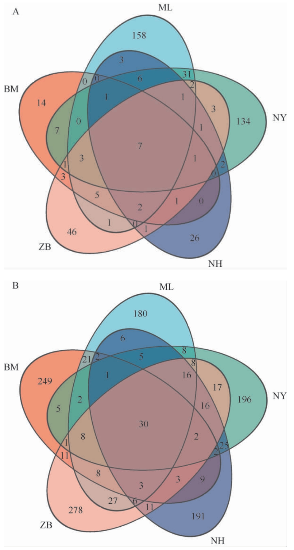图1 不同产地光核桃果实中细菌(A)及真菌(B)扩增子序列变体组成分析韦恩图