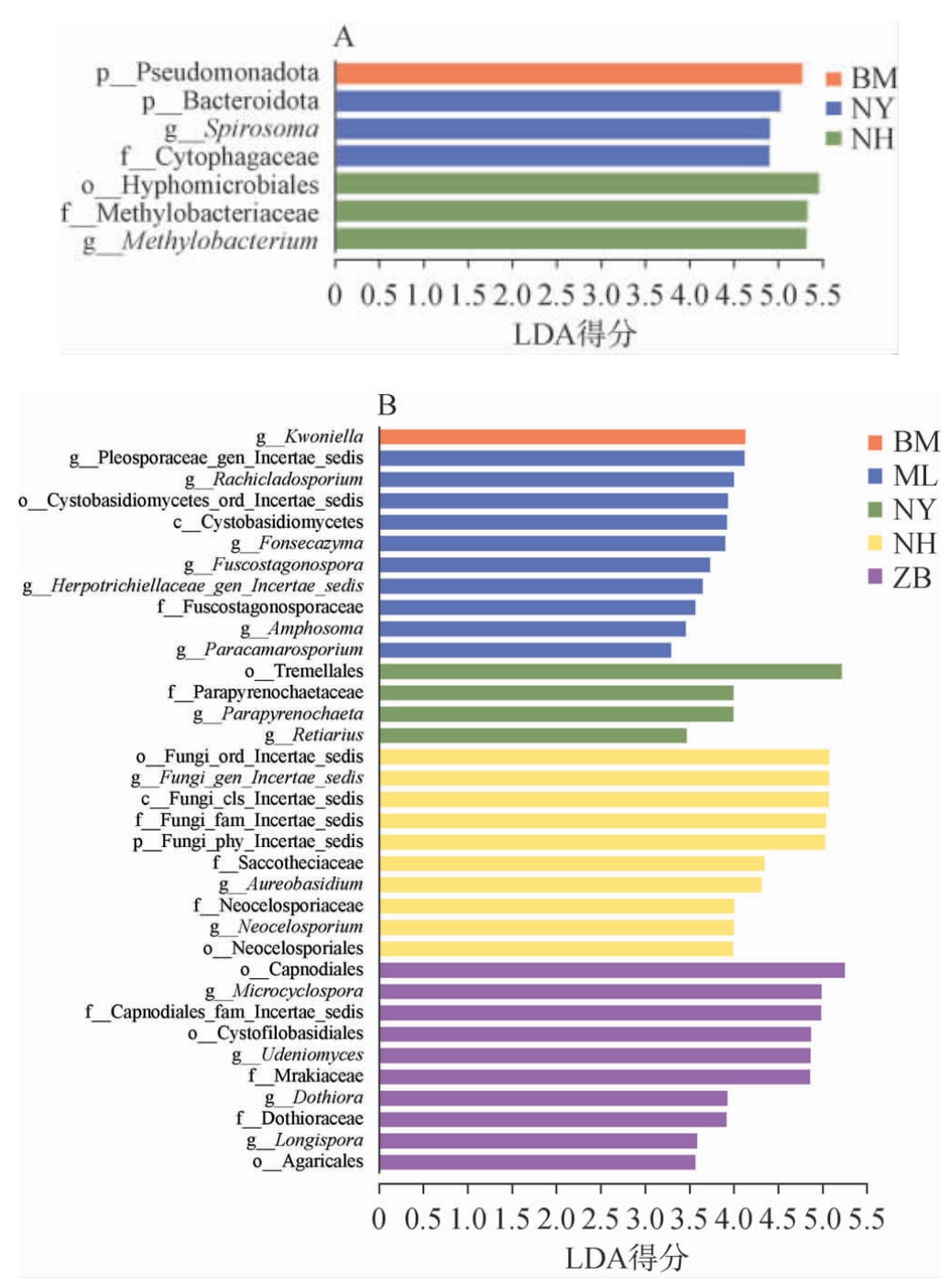 图5 不同产地光核桃果实样品中细菌(A)和真菌(B)群落线性判别分析效应大小分析结果