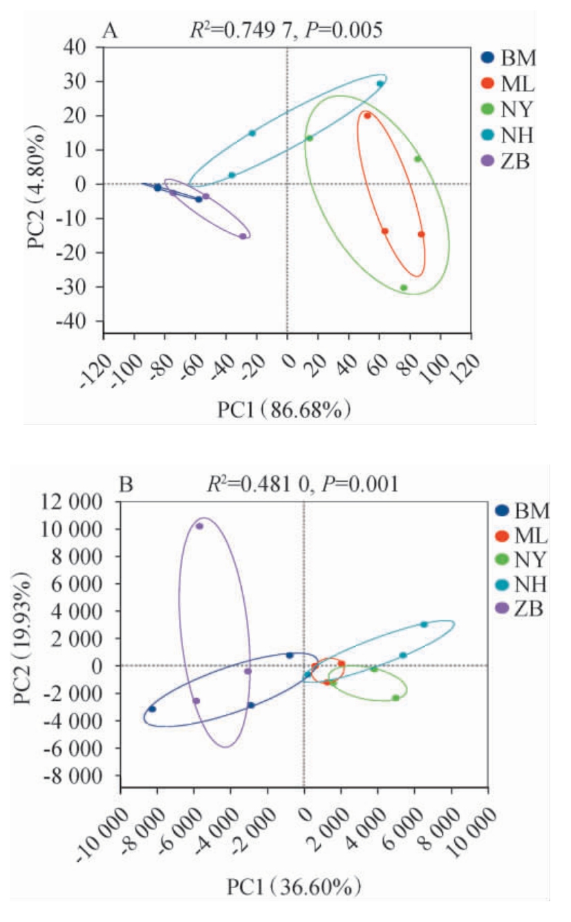 为了分析西藏林芝不同地区光核桃果实样品中微生物群落结构组成的差异,在细菌和真菌属水平上对其进行PCA,结果见图4。由图4A可知,在细菌群落组成中,PC1和PC2的方差贡献率分别为86.68%、4.80%,说明前两个主成分能代表91.48%的原始信息。BM和ZB距离较近,说明这两个产地的细菌群落结构较为相似。ML、NH、NY三个产地的样品点部分重叠,表明它们的细菌群落组成具有一定相似性,但组内变异较大。BM、ZB组与ML、NH、NY组分别位于不同象限,说明它们之间的细菌群落结构差异明显。 由图4B可知,在真菌群落组成中,PC1和PC2的方差贡献率分别为19.93%和36.60%,说明前两个主成分能代表56.53%的原始信息。ML、NY、NH三个产地的样品点重叠较多,表明它们的真菌群落结构较为相似。ZB与ML产地的样品点重叠较多,且与ML、NY、NH三个产地的样品点距离较远,表明他们之间的真菌群落结构组间差异较大,ZB产地的组内样品点分散,组内真菌群落结构存在一定差异,表明该产地真菌群落独特性强并且结构不太稳定或易受局部微环境影响明显。