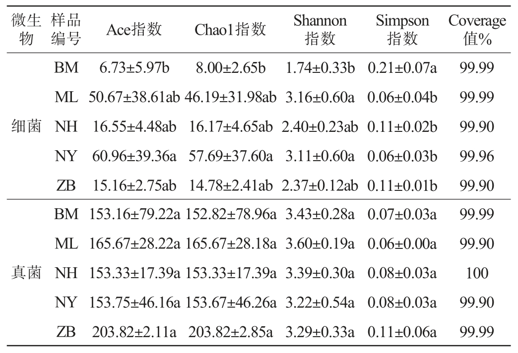 微生物编号 Ace指数Chao1指数Shannon指数样品Simpson指数Coverage值%细菌真菌99.99 99.99 99.90 99.96 99.90 99.99 99.90 100 99.90 99.99 BM ML NH NY ZB BM ML NH NY ZB 6.73±5.97b 50.67±38.61ab 16.55±4.48ab 60.96±39.36a 15.16±2.75ab 153.16±79.22a 165.67±28.22a 153.33±17.39a 153.75±46.16a 203.82±2.11a 8.00±2.65b 46.19±31.98ab 16.17±4.65ab 57.69±37.60a 14.78±2.41ab 152.82±78.96a 165.67±28.18a 153.33±17.39a 153.67±46.26a 203.82±2.85a 1.74±0.33b 3.16±0.60a 2.40±0.23ab 3.11±0.60a 2.37±0.12ab 3.43±0.28a 3.60±0.19a 3.39±0.30a 3.22±0.54a 3.29±0.33a 0.21±0.07a 0.06±0.04b 0.11±0.02b 0.06±0.03b 0.11±0.01b 0.07±0.03a 0.06±0.00a 0.08±0.03a 0.08±0.03a 0.11±0.06a