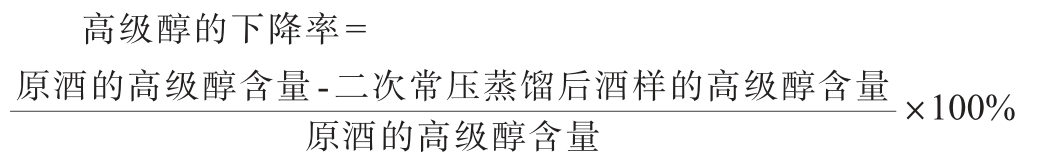 综上所述,利用不同塔层对原酒进行二次常压蒸馏可降低原酒中的乙酸乙酯、乙醛、乙缩醛和高级醇的含量,且当原酒的利用率达到85%以上时,使用20、25和30塔层蒸馏的原酒高级醇下降率分别为68.97%、83.32%、87.97%。 由此可知,塔层数是影响降低原酒高级醇含量的因素之一,且塔层数越多,原酒利用率越高,高级醇含量的降低效果越好。此外,乙酸乙酯、乙醛及乙缩醛等物质的含量亦有所下降。
