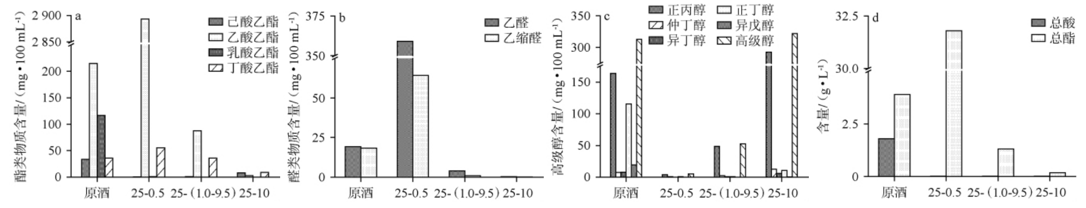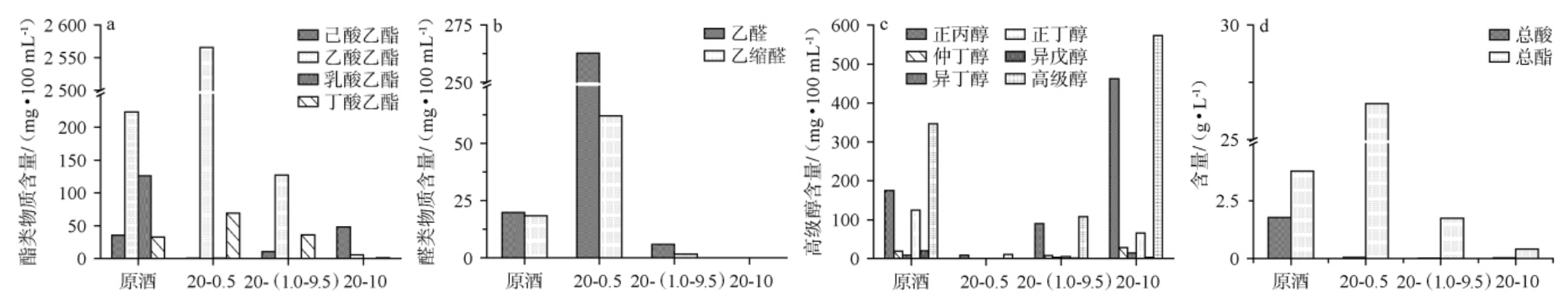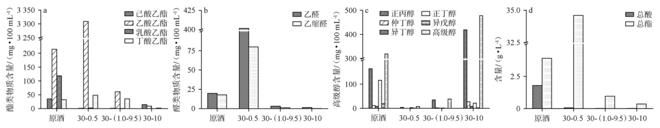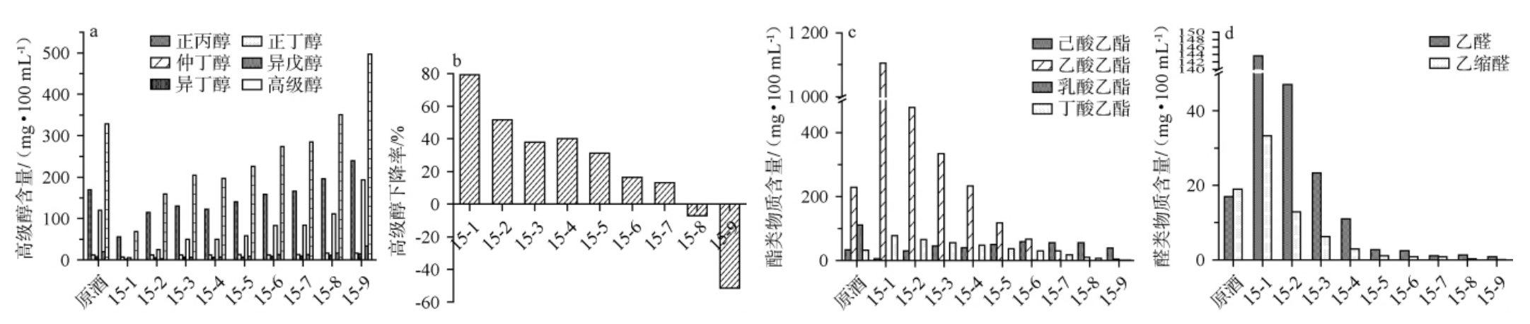 15塔层二次常压蒸馏对浓香型原酒高级醇(a、b)及其他挥发性风味成分(c、d)的影响见图1。