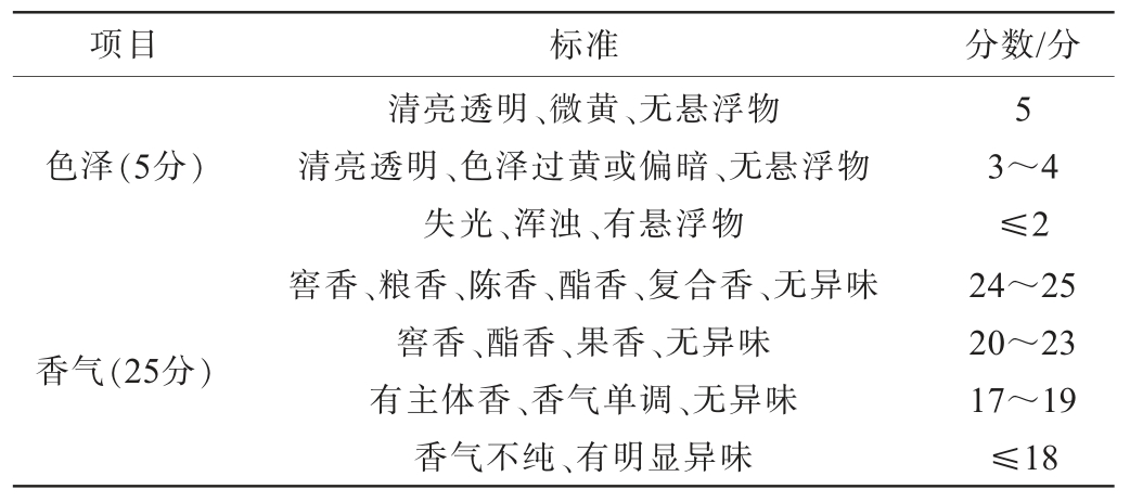 项目标准分数/分5色泽(5分)香气(25分)清亮透明、微黄、无悬浮物清亮透明、色泽过黄或偏暗、无悬浮物失光、浑浊、有悬浮物窖香、粮香、陈香、酯香、复合香、无异味窖香、酯香、果香、无异味有主体香、香气单调、无异味香气不纯、有明显异味3~4≤2 24~25 20~23 17~19≤18