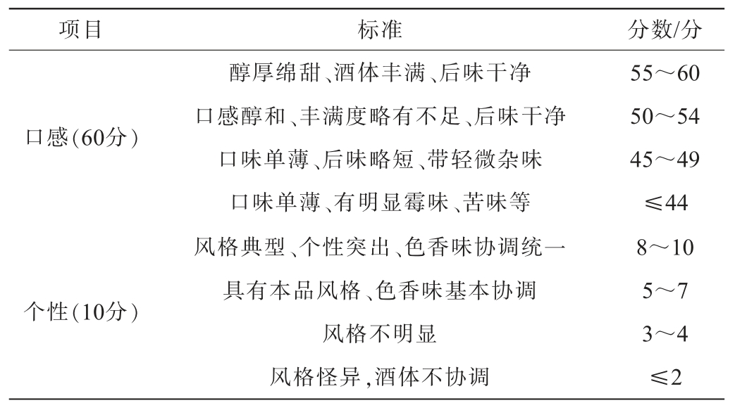 依据GB/T 12315—2008《感官分析方法学排序法》[22]和GB/T 33404—2016《白酒感官品评导则》[23],选取10位获得专业资质的评酒师构成的感官评价小组(含4名国家注册白酒评委及6名省级认证白酒评委),从色泽、香气、口感及个性4个方面进行感官评价,满分为100分。 浓香型原酒感官评价标准见表1。