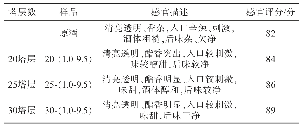 塔层数样品感官描述感官评分/分原酒20塔层25塔层30塔层20-(1.0-9.5)25-(1.0-9.5)30-(1.0-9.5)清亮透明、香杂,入口辛辣、刺激,酒体粗糙,后味杂、欠净清亮透明、酯香突出,入口较刺激,味较醇甜,后味较净清亮透明、酯香明显,入口较刺激,味甜,酒体醇和,后味较净清亮透明、酯香明显,入口较刺激,味甜,后味干净82 84 86 89