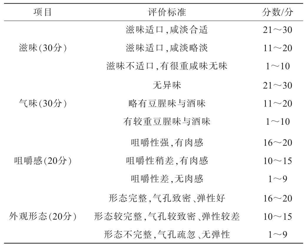 项目评价标准分数/分滋味(30分)气味(30分)咀嚼感(20分)外观形态(20分)滋味适口,咸淡合适滋味适口,咸淡略淡滋味不适口,有很重咸味无味无异味略有豆腥味与酒味有较重豆腥味与酒味咀嚼性强,有肉感咀嚼性稍差,有肉感咀嚼性差,无肉感形态完整,气孔致密、弹性好形态较完整,气孔较致密、弹性较差形态不完整,气孔疏忽、无弹性21~30 11~20 1~10 21~30 11~20 1~10 16~20 10~15 1~9 16~20 10~15 1~9