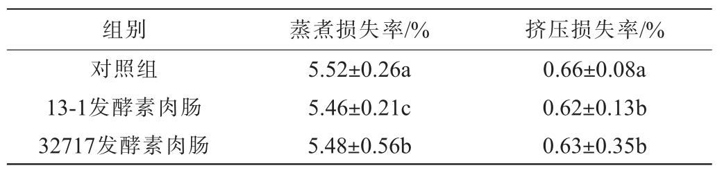 组别蒸煮损失率/%挤压损失率/%对照组13-1发酵素肉肠32717发酵素肉肠5.52±0.26a 5.46±0.21c 5.48±0.56b 0.66±0.08a 0.62±0.13b 0.63±0.35b