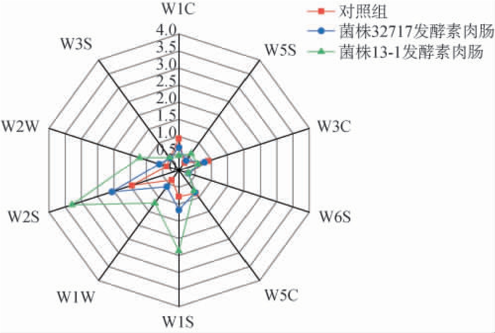 由图1可知,3种大豆蛋白素肉肠在含甲基类,醇醛酮类以及硫化物的释放上表现出较明显的差异。发酵素肉肠在含甲基类、醇醛酮、硫化物以及芳香成分、有机硫化物敏感的传感器响应值(如W1S、W2S、W1W、W2W)比对照组更高,表明其含醇醛酮、芳香成分、硫化物等挥发性风味成分更为丰富;其中菌株13-1发酵大豆蛋白素肉肠比菌株32717发酵素肉肠的醇醛酮、硫化物以及芳香成分、甲基类、有机硫化物、氮氧化合物传感器(W2S、W1W、W1S、W2W、W5S)响应值更高,说明酿酒酵母在促进这些风味物质形成方面更为高效,因而其整体香气轮廓更为浓郁。