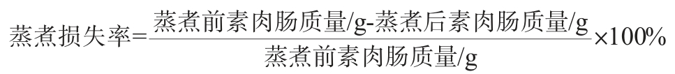 蒸煮损失率的测定参考杜洁晨[15]的方法稍作修改。准确称量发酵大豆蛋白素肉肠及对照组在煮制之前的质量,煮制之后,将其冷却至室温,用吸水纸擦干表面析出的水分和油脂,再次用天平称取其质量,每个样品重复检测3次。蒸煮损失率计算公式如下: