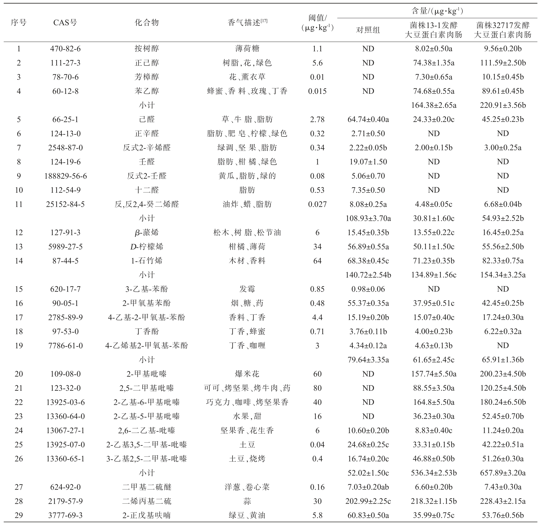 序号CAS号化合物香气描述[17]阈值/(μg·kg-1)1234567891 0 470-82-6 111-27-3 78-70-6 60-12-8薄荷糖树脂,花,绿色花、薰衣草蜂蜜、香料、玫瑰、丁香1.1 5.6 0.01 0.015 11 66-25-1 124-13-0 2548-87-0 124-19-6 188829-56-6 112-54-9 25152-84-5草、牛脂、脂肪脂肪、肥皂、柠檬、绿色绿调、坚果、脂肪脂肪、柑橘、绿色黄瓜,脂肪,绿的脂肪油炸、蜡、脂肪2.78 0.32 0.34 1 0.08 0.53 0.027 12 13 14 127-91-3 5989-27-5 87-44-5松木、树脂、松节油柑橘、薄荷木材、香料6 34 64 15 16 17 18 19 620-17-7 90-05-1 2785-89-9 97-53-0 7786-61-0发霉烟、糖、药香料、丁香丁香,蜂蜜丁香、咖喱0.85 0.48 4.4 0.71 3 20 21 22 23 24 25 26 109-08-0 123-32-0 13925-03-6 13360-64-0 13067-27-1 13925-07-0 13360-65-1爆米花可可、烤坚果、烤牛肉、药巧克力、咖啡、烤坚果香水果,甜坚果香、花生香土豆土豆,烧烤60 80 40 16 6 0.04 0.4 27 28 29 624-92-0 2179-57-9 3777-69-3按树醇正己醇芳樟醇苯乙醇小计己醛正辛醛反式2-辛烯醛壬醛反式2-壬醛十二醛反,反2,4-癸二烯醛小计β-蒎烯D-柠檬烯1-石竹烯小计3-乙基-苯酚2-甲氧基苯酚4-乙基-2-甲氧基-苯酚丁香酚4-乙烯基2-甲氧基-苯酚小计2-甲基吡嗪2,5-二甲基吡嗪2-乙基-6-甲基吡嗪2-乙基-5-甲基吡嗪2,6-二乙基-吡嗪2-乙基3,5-二甲基-吡嗪3-乙基2,5-二甲基-吡嗪小计二甲基二硫醚二烯丙基二硫2-正戊基呋喃洋葱、卷心菜蒜绿豆、黄油0.16 30 5.8含量/(μg·kg-1)对照组菌株13-1发酵大豆蛋白素肉肠ND ND ND ND 64.74±0.40a 2.71±0.50 2.22±0.05b 19.07±1.50 5.06±0.70 7.35±0.50 8.08±0.25a 108.93±3.70a 15.45±0.35b 56.89±0.55a 68.38±0.45c 140.72±2.54b 0.98±0.06 55.37±0.35a 15.19±0.20b 3.76±0.11b 4.34±0.12a 79.64±3.35a ND ND ND ND 10.60±0.20b 24.68±0.25c 16.74±0.20c 52.02±1.50c 7.03±0.20ab 202.99±2.25c 60.83±0.50a 8.02±0.50a 74.38±1.35a 7.30±0.65a 74.68±0.55a 164.38±2.65a 24.33±0.20c ND 2.00±0.15b ND ND ND 4.48±0.05c 30.81±1.60c 13.55±0.22c 50.11±1.50c 71.23±0.35b 134.89±1.56c ND 37.95±0.51c 15.07±0.40c 4.00±0.23b 4.63±0.13b 61.65±2.45c 157.74±5.50a 88.55±3.50a 164.8±5.50a 36.23±0.30a 8.83±0.40c 33.31±0.15b 46.88±0.50b 536.34±2.53b 6.60±0.20b 218.32±1.15b 35.99±0.75c菌株32717发酵大豆蛋白素肉肠9.56±0.20b 111.59±2.50b 10.15±0.45b 89.61±0.45b 220.91±3.56b 45.25±0.23b ND 3.00±0.25a ND ND ND 6.68±0.04b 54.93±2.52b 16.45±0.25a 55.56±2.50b 82.33±0.75a 154.34±3.25a ND 42.45±0.25b 17.24±0.30a 6.22±0.32a ND 65.91±1.36b 200.23±4.50b 120.25±4.50b 180.24±6.50b 52.45±0.70b 11.24±0.20a 42.22±0.51a 51.26±0.30a 657.89±3.20a 7.43±0.30a 228.43±2.15a 53.76±0.56b