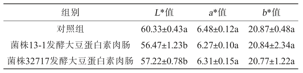 组别L*值a*值b*值对照组菌株13-1发酵大豆蛋白素肉肠菌株32717发酵大豆蛋白素肉肠60.33±0.43a 56.47±1.23b 57.22±0.78b 6.48±0.12a 6.27±0.10a 6.31±0.15a 20.87±0.48a 20.84±2.34a 20.77±1.22a