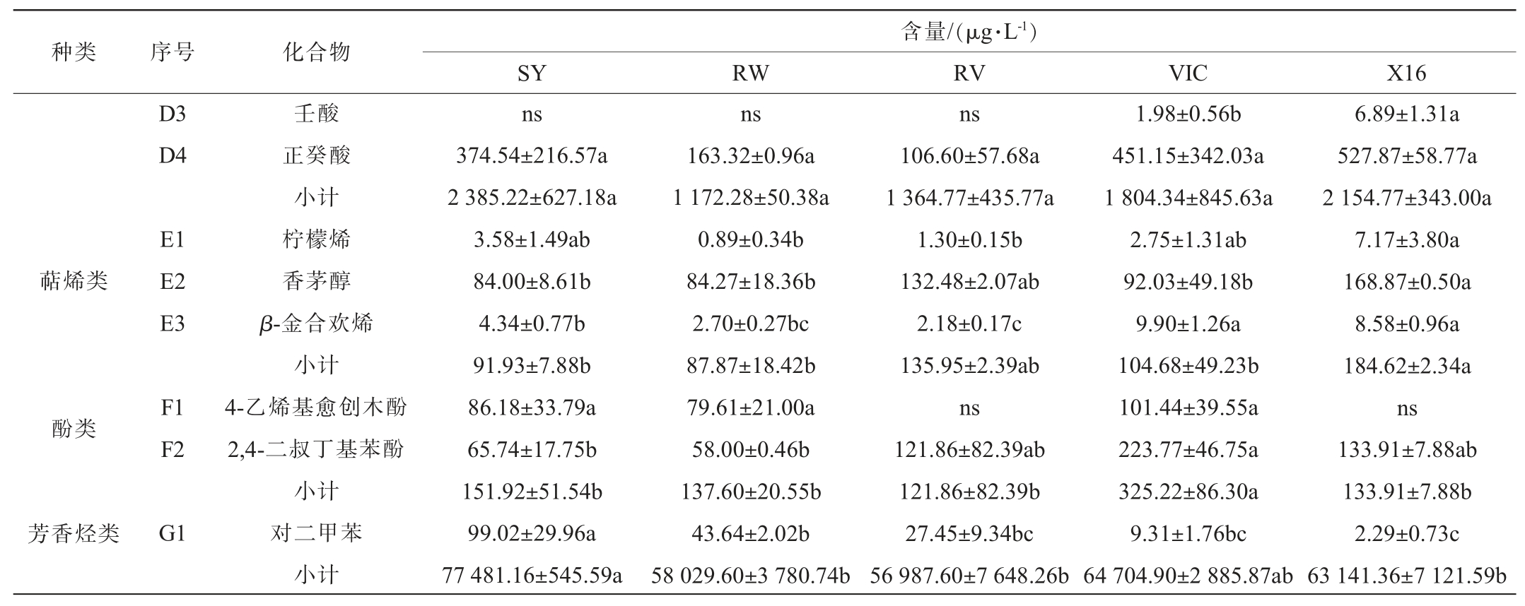 种类序号化合物D3 D4萜烯类E1 E2 E3酚类F1 F2芳香烃类G1壬酸正癸酸小计柠檬烯香茅醇β-金合欢烯小计4-乙烯基愈创木酚2,4-二叔丁基苯酚小计对二甲苯小计含量/(μg·L-1)SYRWRVVICX16 ns 374.54±216.57a 2 385.22±627.18a 3.58±1.49ab 84.00±8.61b 4.34±0.77b 91.93±7.88b 86.18±33.79a 65.74±17.75b 151.92±51.54b 99.02±29.96a 77 481.16±545.59a ns 163.32±0.96a 1 172.28±50.38a 0.89±0.34b 84.27±18.36b 2.70±0.27bc 87.87±18.42b 79.61±21.00a 58.00±0.46b 137.60±20.55b 43.64±2.02b 58 029.60±3 780.74b ns 106.60±57.68a 1 364.77±435.77a 1.30±0.15b 132.48±2.07ab 2.18±0.17c 135.95±2.39ab ns 121.86±82.39ab 121.86±82.39b 27.45±9.34bc 56 987.60±7 648.26b 1.98±0.56b 451.15±342.03a 1 804.34±845.63a 2.75±1.31ab 92.03±49.18b 9.90±1.26a 104.68±49.23b 101.44±39.55a 223.77±46.75a 325.22±86.30a 9.31±1.76bc 64 704.90±2 885.87ab 6.89±1.31a 527.87±58.77a 2 154.77±343.00a 7.17±3.80a 168.87±0.50a 8.58±0.96a 184.62±2.34a ns 133.91±7.88ab 133.91±7.88b 2.29±0.73c 63 141.36±7 121.59b