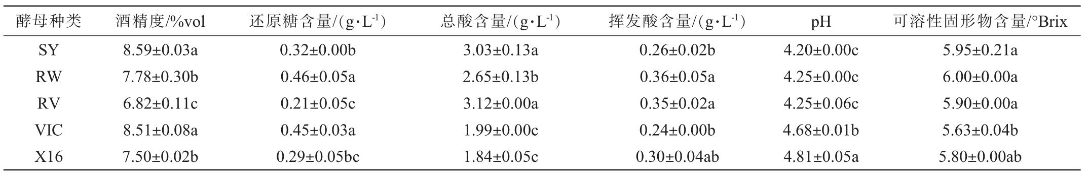 目前,国内关于秋月梨酒的酿造研究鲜见报道,因此,本研究选用5种商业酿酒酵母(SY、RW、RV100、VIC、Zymaflore X16)分别发酵秋月梨汁制备梨酒,并对其基础理化指标、活性成分(总酚、总黄酮)含量、抗氧化能力、挥发性风味物质及感官品质进行检测分析,旨在探究不同商业酿酒酵母对秋月梨酒品质的影响,以期为秋月梨酒的产品开发和品质提升提供理论依据。