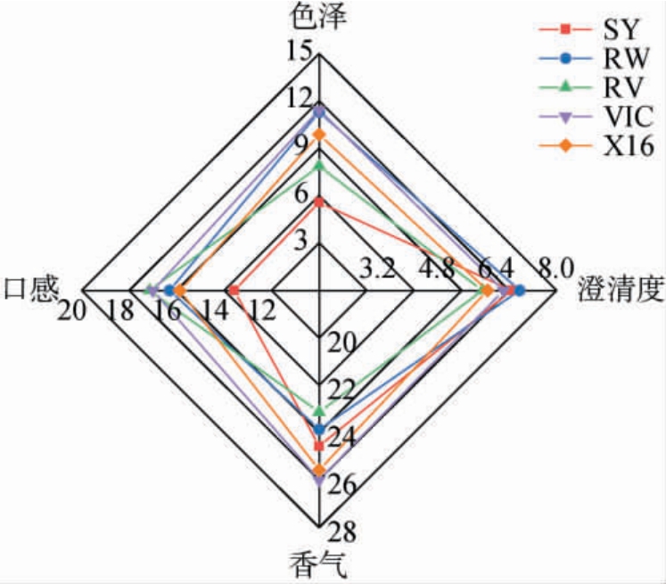 不同酵母发酵秋月梨酒的感官评价结果见图4。由图4可知,在色泽上,酵母VIC(11.43分)和酵母RW(11.29分)发酵秋月梨酒的得分较高。在澄清度上,酵母RW发酵秋月梨酒的得分最高(7.00分)。在香气上,酵母VIC(26.00分)和酵母X16(25.57分)发酵秋月梨酒的得分较高,其次是酵母SY(24.57分)和酵母RW(23.86分),酵母RV发酵秋月梨酒的得分最低(23.14分)。在口感上,酵母RV(17.14分)和VIC(17.00分)发酵秋月梨酒的得分最高,其次是酵母RW(16.29分)和X16(15.86分),酵母SY发酵秋月梨酒的得分最低(13.57分)。 综上,酵母VIC发酵秋月梨酒的总分最高(61.00分),其次是酵母RW(58.43分)和酵母X16(57.43分)。酵母VIC发酵秋月梨酒色泽更加透亮,果香更加浓郁,口感更加协调,曾硕等[17]研究发现,在不同酿酒酵母发酵的猕猴桃酒中,酵母VIC发酵的果酒香气最浓郁,总体评价最高,这可能与VIC发酵后的酒中酯类物质含量最高有关。