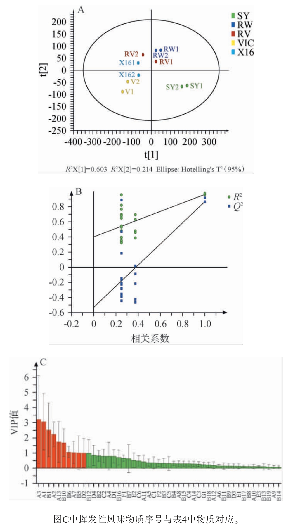 图3 不同酵母发酵秋月梨酒挥发性风味物质的偏最小二乘-判别分析得分散点图(A)、200次置换检验结果(B)及变量投影重要性值(C)