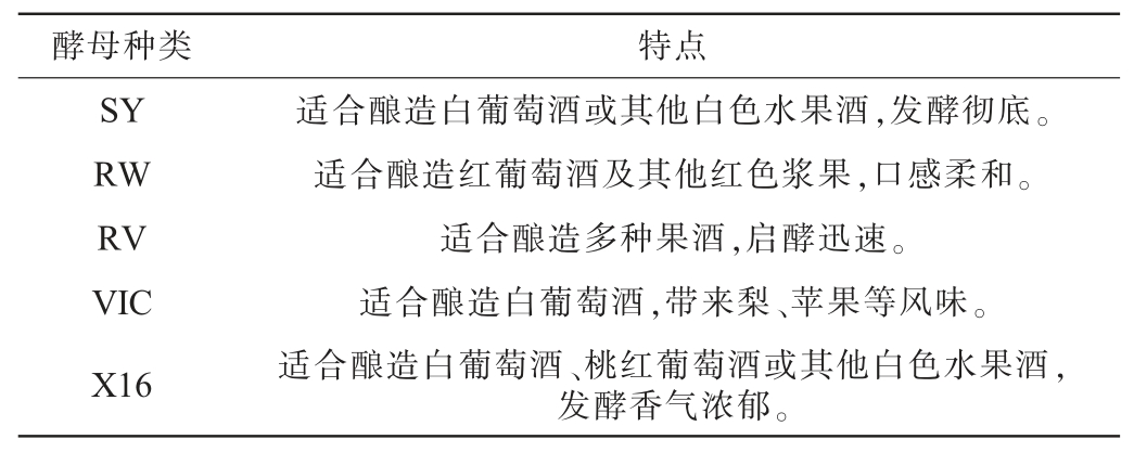 秋月梨:河北省沧州市九合市场;果酒专用酿酒酵母SY、RW、RV100(RV)、Vivance(VIC):安琪酵母股份有限公司;Zymaflore X16果酒专用酿酒酵母(X16):法国LAFFORT公司。根据产品信息,5种酿酒酵母的特点见表1。