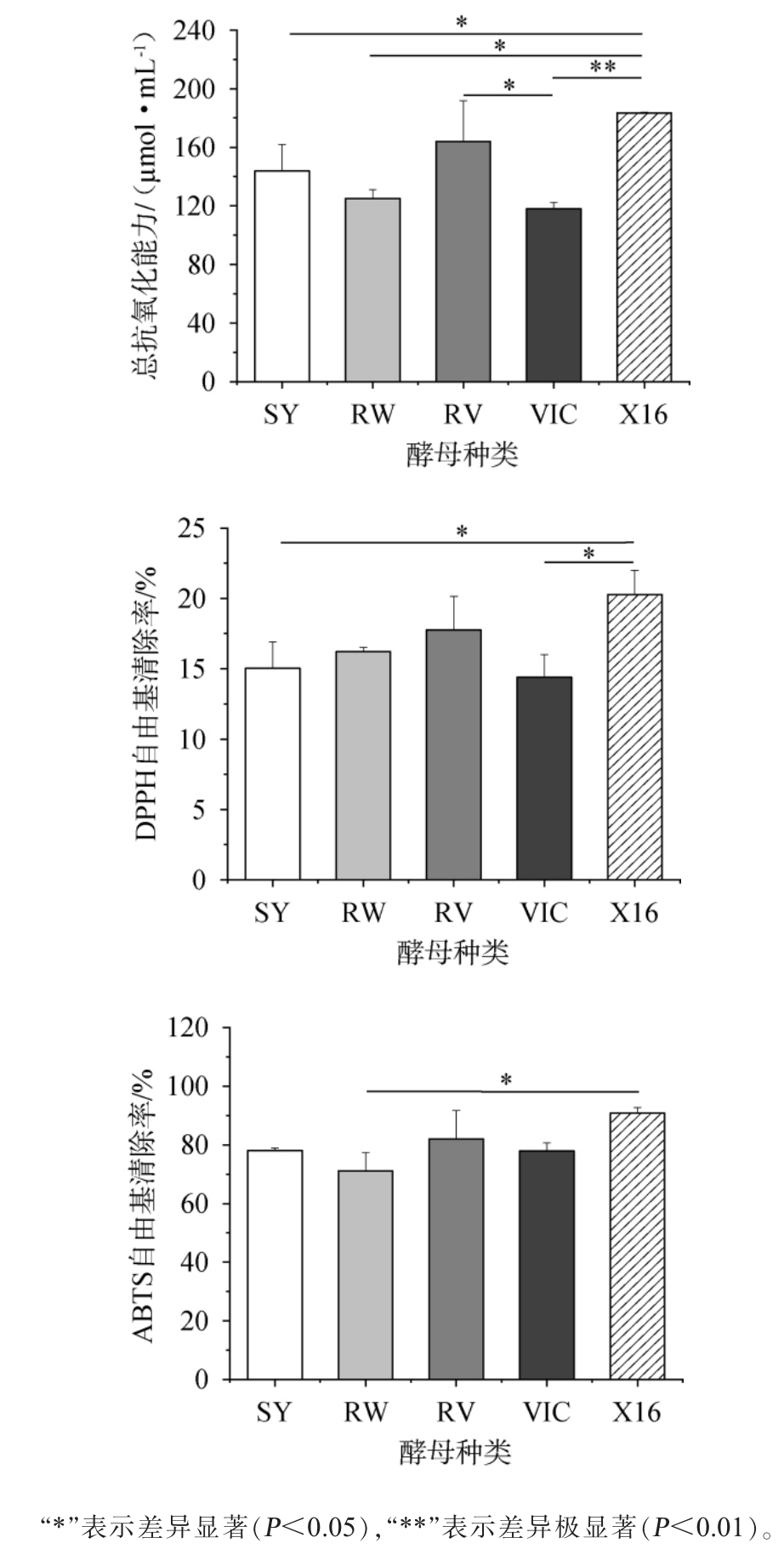 抗氧化活性是评价果酒营养功能的重要指标,测定不同酵母发酵秋月梨酒的抗氧化能力,结果见图2。由图2可知,酵母X16发酵秋月梨酒的总抗氧化能力、DPPH自由基清除率及ABTS自由基清除率均最高,分别为183.40 μmol/mL、20.27%、90.77%。 其次为酵母RV发酵秋月梨酒,分别为163.92 μmol/mL、17.75%、82.01%。酚类物质和黄酮类物质含量差异易造成果酒抗氧化能力的差异[5],酵母X16发酵秋月梨酒的总抗氧化能力最强,显著高于酵母SY、RW发酵梨酒(P<0.05),极显著高于酵母VIC发酵梨酒(P<0.01)。酵母X16发酵秋月梨酒的DPPH自由基清除率显著高于酵母SY和VIC,其ABTS自由基清除率显著高于RW(P<0.05)。可能与该酒中总酚及总黄酮含量最高有关。 然而,抗氧化性结果和总酚及总黄酮含量结果不完全一致,可能是酚类物质和黄酮类物质的组成差异造成,也可能是它们之间的协同作用导致[5]。 综上,酵母X16发酵秋月梨酒的抗氧化能力最强。
