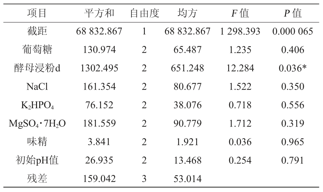 由表4可知,酵母浸粉d对普鲁兰多糖的产量具有显著影响(P<0.05),其余各因素对普鲁兰多糖的产量影响不显著(P>0.05)。各因素对结果影响顺序为酵母浸粉d>MgSO4·7H2O>NaCl>葡萄糖>味精>K2HPO4>初始pH值。