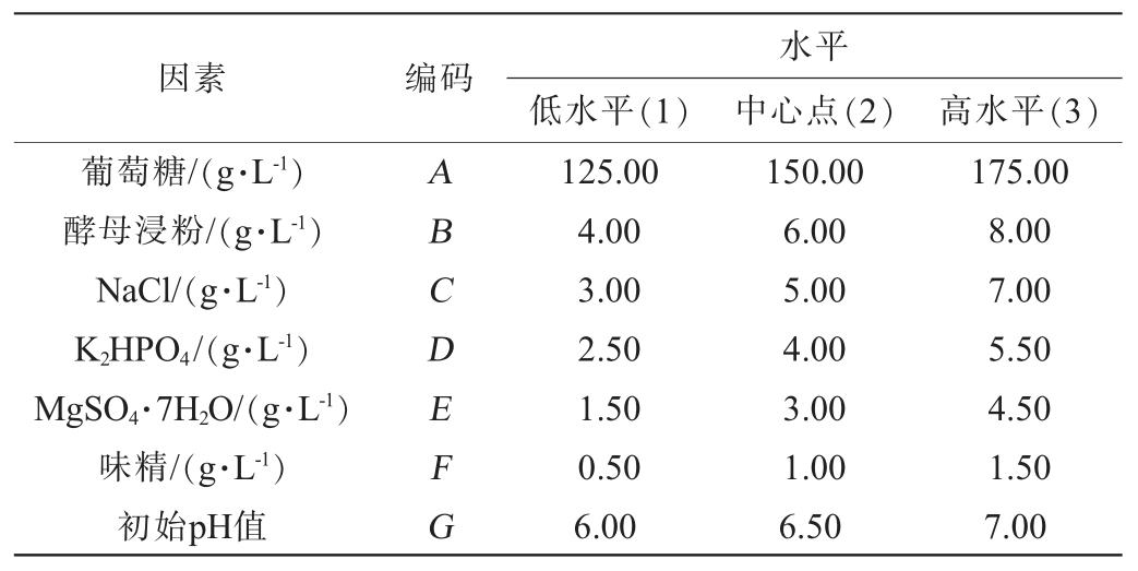 因素编码低水平(1)水平中心点(2) 高水平(3)葡萄糖/(g·L-1)酵母浸粉/(g·L-1)NaCl/(g·L-1)K2HPO4/(g·L-1)MgSO4·7H2O/(g·L-1)味精/(g·L-1)初始pH值ABCDEFG 125.00 4.00 3.00 2.50 1.50 0.50 6.00 150.00 6.00 5.00 4.00 3.00 1.00 6.50 175.00 8.00 7.00 5.50 4.50 1.50 7.00