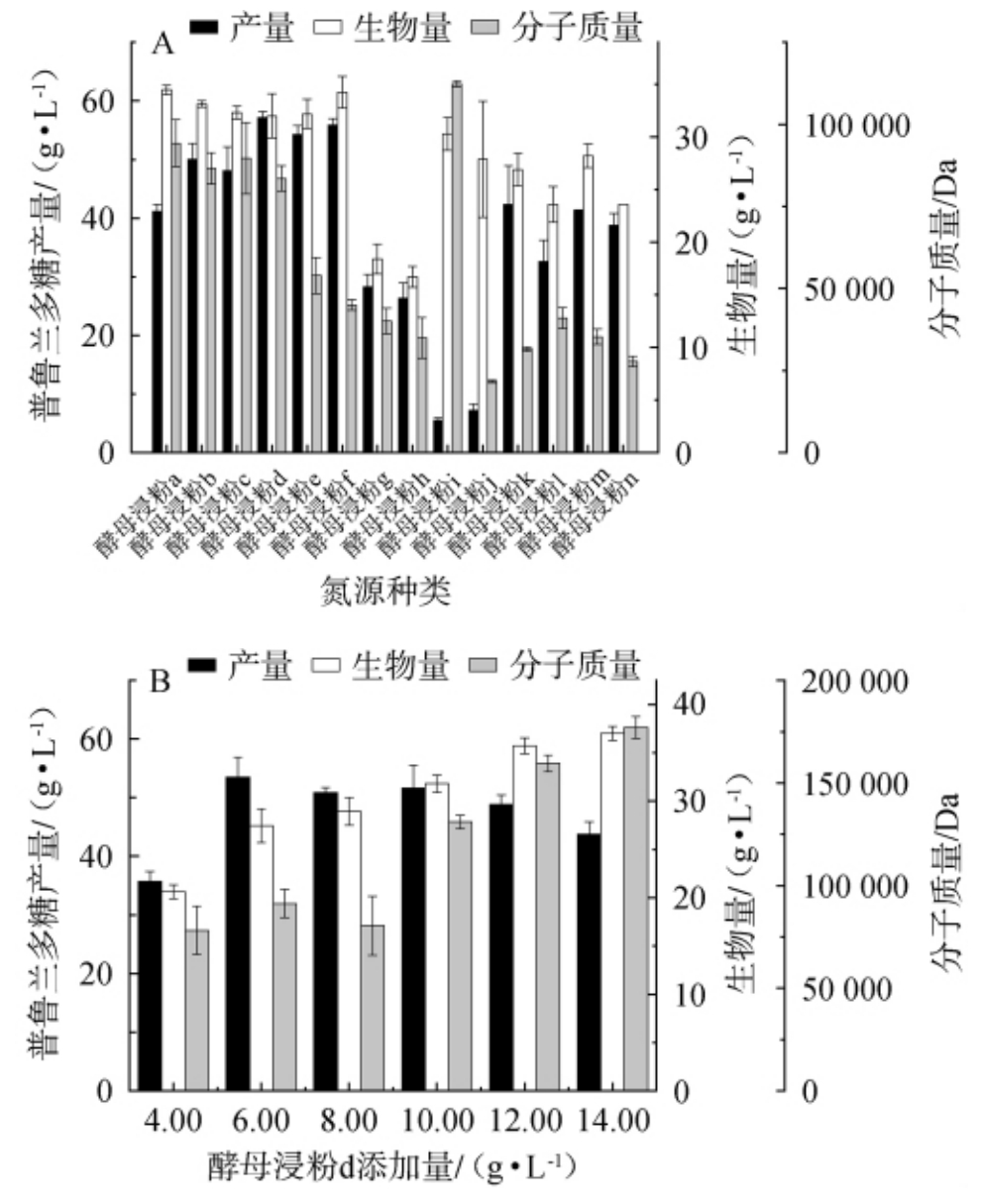 图3 不同氮源种类(A)和酵母浸粉d添加量(B)对菌株UV013发酵产普鲁兰多糖的影响