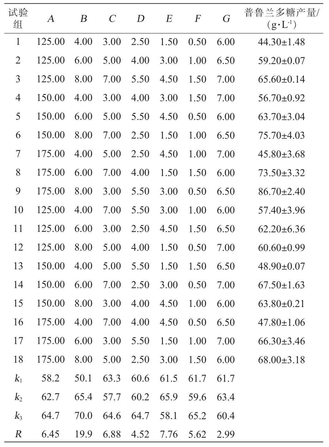 试验组ABCDEFG普鲁兰多糖产量/(g·L-1)1 2 3 4 5 6 7 8 9 1 0 11 12 13 14 15 16 17 18 k1 k2 44.30±1.48 59.20±0.07 65.60±0.14 56.70±0.92 63.70±3.04 75.70±4.03 45.80±3.68 73.50±3.32 86.70±2.40 57.40±3.96 62.20±6.36 60.60±0.99 48.90±0.07 67.50±1.63 63.80±0.21 47.80±1.06 66.30±3.46 68.00±3.18 k3 R 125.00 125.00 125.00 150.00 150.00 150.00 175.00 175.00 175.00 125.00 125.00 125.00 150.00 150.00 150.00 175.00 175.00 175.00 58.2 62.7 64.7 6.45 4.00 6.00 8.00 4.00 6.00 8.00 4.00 6.00 8.00 4.00 6.00 8.00 4.00 6.00 8.00 4.00 6.00 8.00 50.1 65.4 70.0 19.9 3.00 5.00 7.00 3.00 5.00 7.00 5.00 7.00 3.00 7.00 3.00 5.00 5.00 7.00 3.00 7.00 3.00 5.00 63.3 57.7 64.6 6.88 2.50 4.00 5.50 4.00 5.50 2.50 2.50 4.00 5.50 5.50 2.50 4.00 5.50 2.50 4.00 4.00 5.50 2.50 60.6 60.2 64.7 4.52 1.50 3.00 4.50 3.00 4.50 1.50 4.50 1.50 3.00 3.00 4.50 1.50 1.50 3.00 4.50 4.50 1.50 3.00 61.5 65.9 58.1 7.76 0.50 1.00 1.50 1.50 0.50 1.00 1.00 1.50 0.50 1.00 1.50 0.50 1.50 0.50 1.00 0.50 1.00 1.50 61.7 59.6 65.2 5.62 6.00 6.50 7.00 7.00 6.00 6.50 7.00 6.00 6.50 6.00 6.50 7.00 6.50 7.00 6.00 6.50 7.00 6.00 61.7 63.4 60.4 2.99