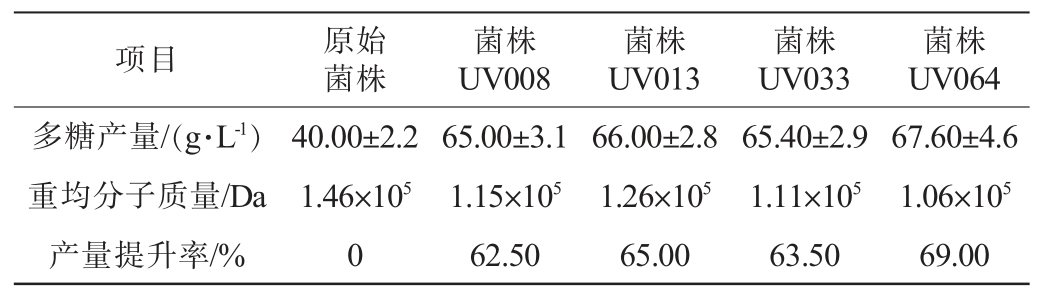 项目原始菌株菌株UV008菌株UV013菌株UV033菌株UV064多糖产量/(g·L-1)重均分子质量/Da产量提升率/%40.00±2.2 1.46×105 0 65.00±3.1 1.15×105 62.50 66.00±2.8 1.26×105 65.00 65.40±2.9 1.11×105 63.50 67.60±4.6 1.06×105 69.00