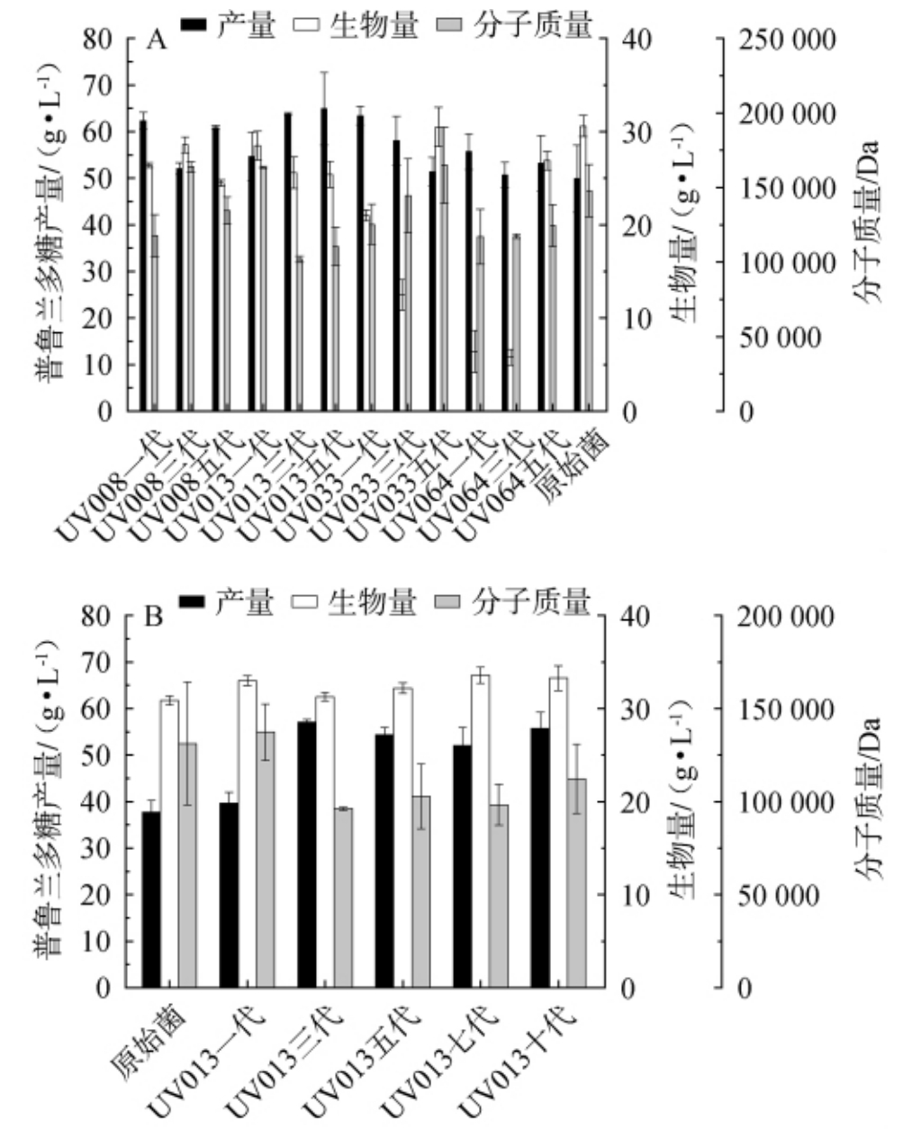 以普鲁兰多糖产量、分子质量和生物量为评价指标,诱变菌株UV008、UV013、UV033、UV064进行五代以内遗传稳定性试验及诱变菌株UV013十代以内遗传稳定性验证试验结果见图2。