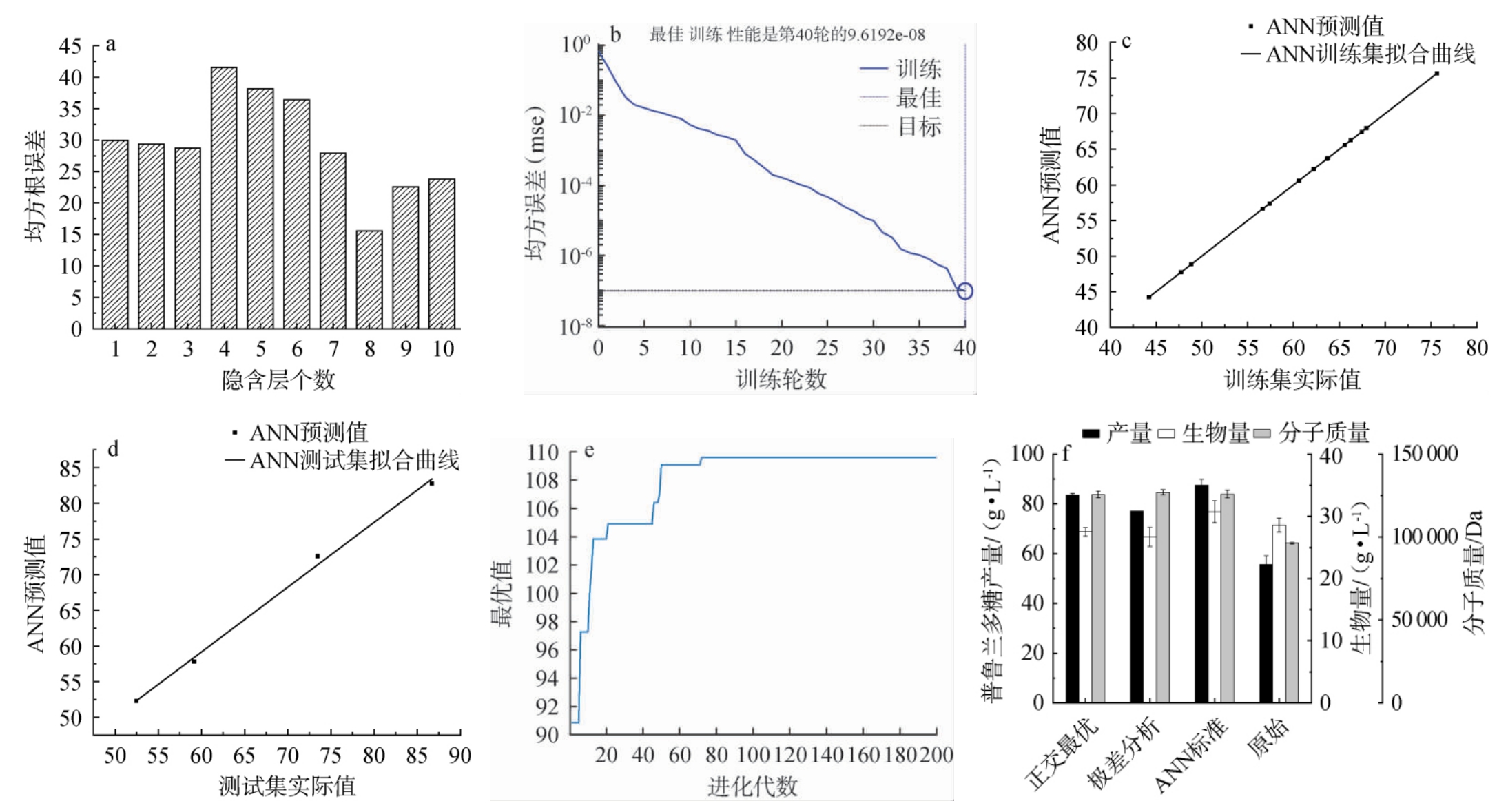 机器学习可以利用人工神经网络(ANN)和遗传算法(genetic algorithm,GA)处理复杂非线性关系,通过主动学习动态调整实验设计,具有高效准确、可实现多目标优化、支持工业化放大的优点[13-14]。现今,人工神经网络已被广泛应于各种发酵条件优化的建模和预测[15-16]。 在普鲁兰多糖发酵条件的优化过程中,采用GA-ANN进行发酵培养基的优化可以提高普鲁兰多糖的产量[17]。机器学习优化技术相比传统的优化策略(如响应面试验设计、正交试验设计等)具有更好的适用性,凸显了机器学习技术在复杂生物过程优化中的显著优势[18-19]。 正交实验偶联人工神经网络可以对显著因素进行精细优化,处理复杂非线性关系,提升优化效率和精度。