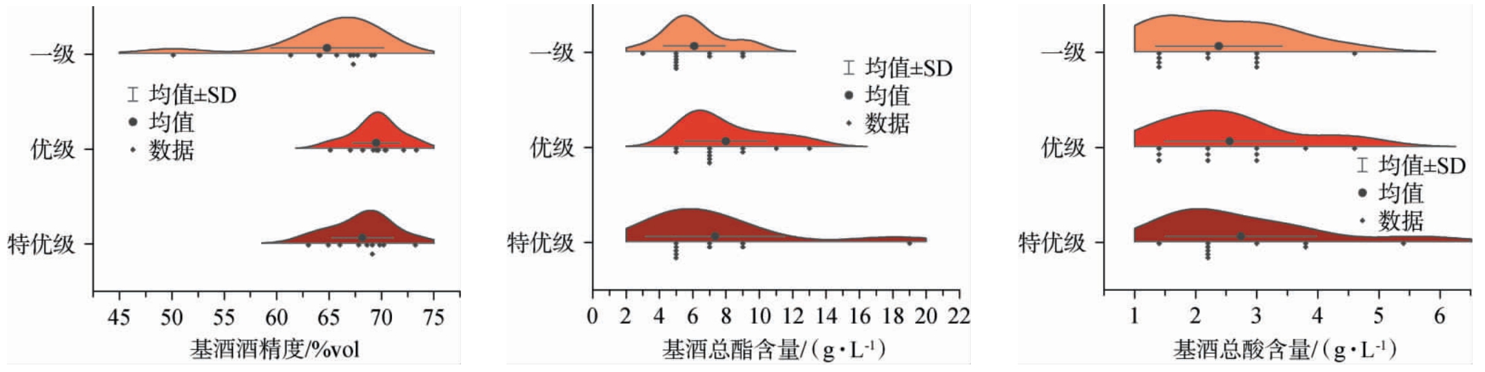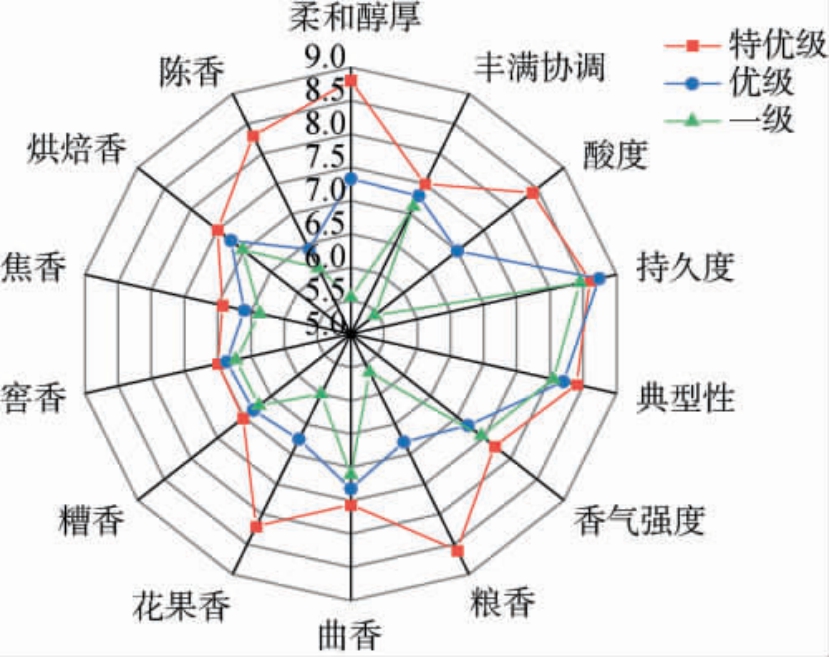 本研究通过对33个浓香型白酒基酒样品进行感官量化分析,结果见图1。 由图1可知,系统评价了不同质量等级基酒的感官差异,其中酸度、粮香、花果香、陈香、柔和醇厚五个指标在不同等级基酒中存在明显区别,其中特优级基酒在所选择的五项核心指标上均优于优级与一级基酒。 随着基酒等级提升,酸味逐渐协调,花果香、粮香更加浓郁,口感协调性上升、醇厚度增加,特优级基酒有更突出的陈香。