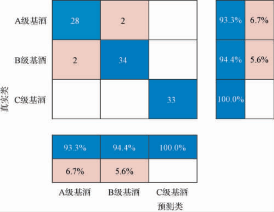 SVM是一种强大的监督学习算法,广泛应用于分类和回归任务[21-22],在白酒领域的应用主要集中在质量评估、分类鉴别、生产过程优化和市场分析等方面[23-25]。SVM对于高维数据有很好的适应性,尤其是在数据的特征维度远大于样本数量时。 这使得它在处理文本分类、图像识别等高维数据问题时表现出色。 在白酒数据处理时,每个风味化合物可以作为一个特征,总特征数远大于样品数量,但SVM仍然能够有效地进行分类。 根据33组样品,每组3个平行,合计99个样本,运用所筛选出VIP值>1且OAV>1的10种差异挥发性化合物含量建立模型,为了评估分类模型性能,构建了一个混淆矩阵展示模型预测结果与实际结果之间的关系,结果见图5。 该矩阵的行表示预测类别,列表示真实类别,对角线上蓝色底色的值表示正确分类的数量,而非对角线上红色底色的值表示错误分类的数量。 由图5可知,模型整体分类准确率95.96%,其中,C级基酒的区分度最强,全部被正确识别;A级样本有2个被误判为B级,B级样本有2个被误判为A级,A级和B级基酒整体识别率分别为93.3%和94.4%。SVM模型证明筛选出的物质并非过拟合的产物,而是一个简约、高效且具有强大判别能力的特征组合,可以对所研究的不同等级浓香型白酒基酒进行等级划分。