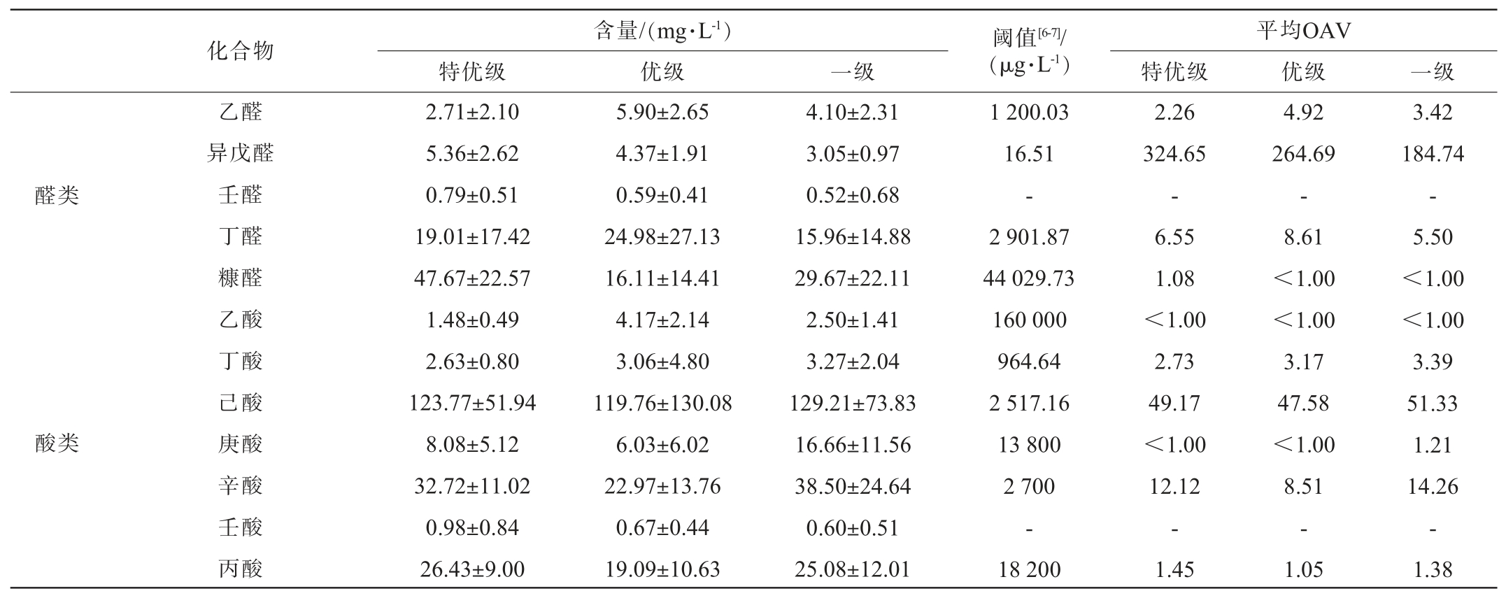 化合物阈值[6-7]/(μg·L-1)特优级含量/(mg·L-1)优级一级特优级平均OAV优级一级醛类酸类乙醛异戊醛壬醛丁醛糠醛乙酸丁酸己酸庚酸辛酸壬酸丙酸2.71±2.10 5.36±2.62 0.79±0.51 19.01±17.42 47.67±22.57 1.48±0.49 2.63±0.80 123.77±51.94 8.08±5.12 32.72±11.02 0.98±0.84 26.43±9.00 5.90±2.65 4.37±1.91 0.59±0.41 24.98±27.13 16.11±14.41 4.17±2.14 3.06±4.80 119.76±130.08 6.03±6.02 22.97±13.76 0.67±0.44 19.09±10.63 4.10±2.31 3.05±0.97 0.52±0.68 15.96±14.88 29.67±22.11 2.50±1.41 3.27±2.04 129.21±73.83 16.66±11.56 38.50±24.64 0.60±0.51 25.08±12.01 1 200.03 16.51-2 901.87 44 029.73 160 000 964.64 2 517.16 13 800 2 700-18 200 2.26 324.65-6.55 1.08<1.00 2.73 49.17<1.00 12.12-1.45 4.92 264.69-8.61<1.00<1.00 3.17 47.58<1.00 8.51-1.05 3.42 184.74-5.50<1.00<1.00 3.39 51.33 1.21 14.26-1.38