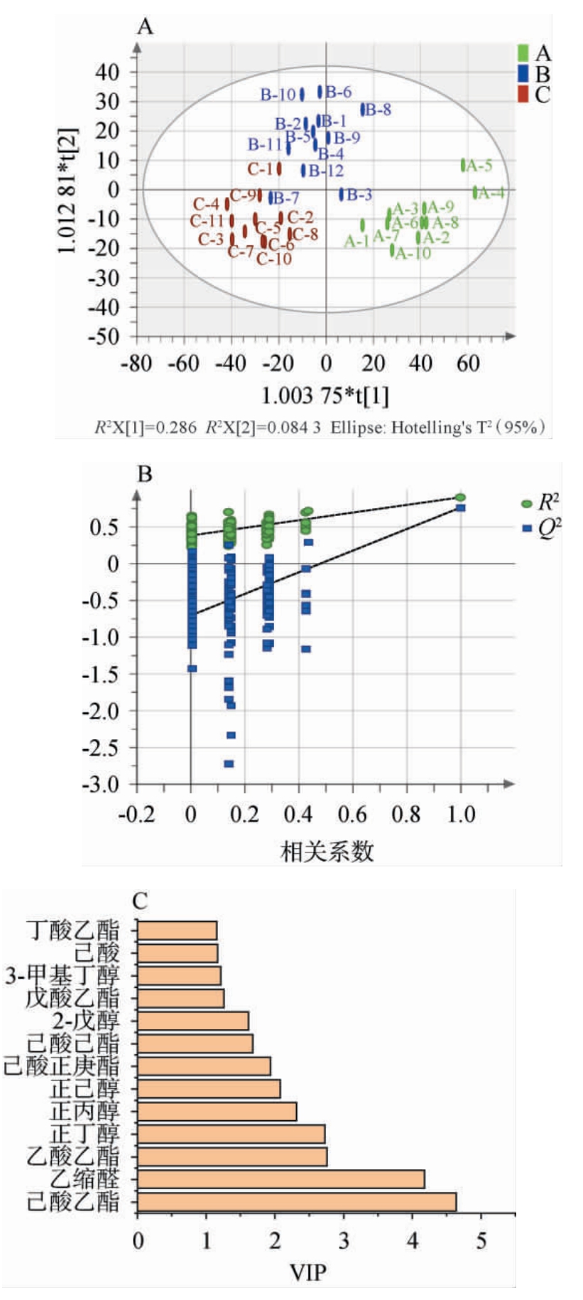 Fig. 4 Orthogonal partial least squares discriminant analysis (A),permutation test results (B), and variable importance in the projection values (C) of base liquor with different quality grades