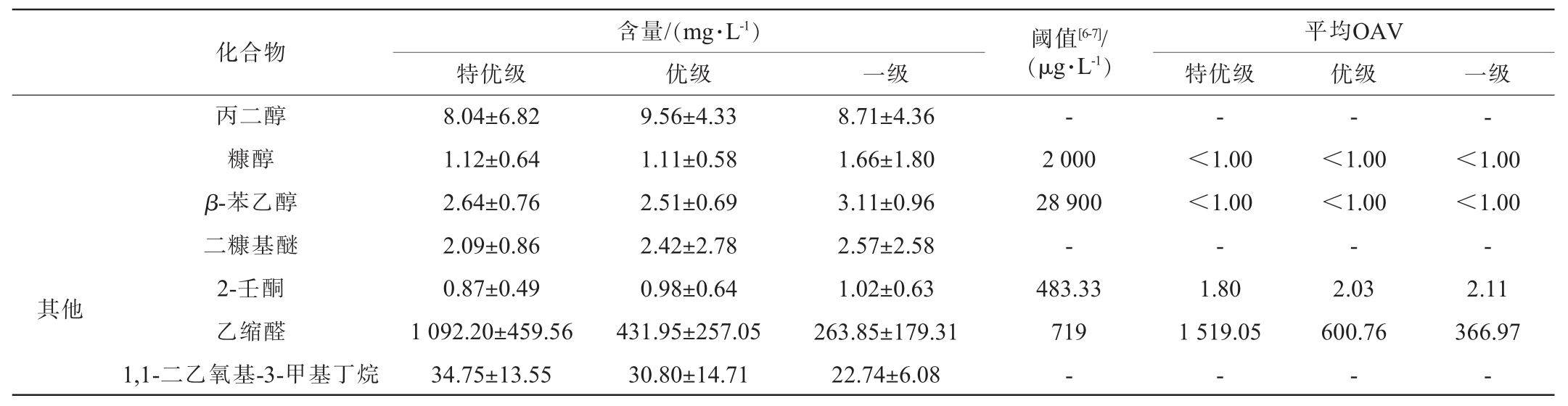 化合物阈值[6-7]/(μg·L-1)特优级含量/(mg·L-1)优级一级特优级平均OAV优级一级其他丙二醇糠醇β-苯乙醇二糠基醚2-壬酮乙缩醛1,1-二乙氧基-3-甲基丁烷8.04±6.82 1.12±0.64 2.64±0.76 2.09±0.86 0.87±0.49 1 092.20±459.56 34.75±13.55 9.56±4.33 1.11±0.58 2.51±0.69 2.42±2.78 0.98±0.64 431.95±257.05 30.80±14.71 8.71±4.36 1.66±1.80 3.11±0.96 2.57±2.58 1.02±0.63 263.85±179.31 22.74±6.08-2 000 28 900-483.33 719--<1.00<1.00-1.80 1 519.05--<1.00<1.00-2.03 600.76--<1.00<1.00-2.11 366.97-