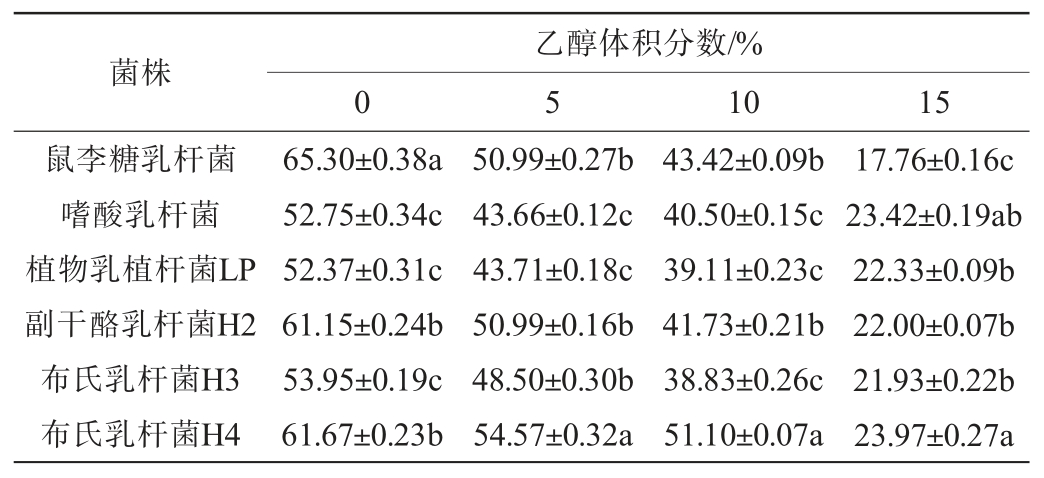 菌株乙醇体积分数/%0 5 1015鼠李糖乳杆菌嗜酸乳杆菌植物乳植杆菌LP副干酪乳杆菌H2布氏乳杆菌H3布氏乳杆菌H4 65.30±0.38a 52.75±0.34c 52.37±0.31c 61.15±0.24b 53.95±0.19c 61.67±0.23b 50.99±0.27b 43.66±0.12c 43.71±0.18c 50.99±0.16b 48.50±0.30b 54.57±0.32a 43.42±0.09b 40.50±0.15c 39.11±0.23c 41.73±0.21b 38.83±0.26c 51.10±0.07a 17.76±0.16c 23.42±0.19ab 22.33±0.09b 22.00±0.07b 21.93±0.22b 23.97±0.27a
