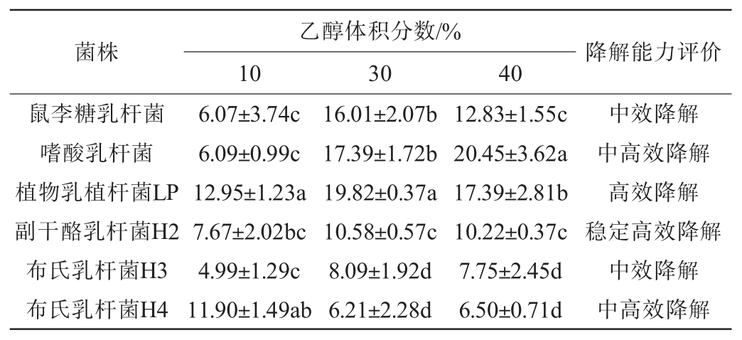 乙醇体积分数/%103040菌株降解能力评价鼠李糖乳杆菌嗜酸乳杆菌植物乳植杆菌LP副干酪乳杆菌H2布氏乳杆菌H3布氏乳杆菌H4 6.07±3.74c 6.09±0.99c 12.95±1.23a 7.67±2.02bc 4.99±1.29c 11.90±1.49ab 16.01±2.07b 17.39±1.72b 19.82±0.37a 10.58±0.57c 8.09±1.92d 6.21±2.28d 12.83±1.55c 20.45±3.62a 17.39±2.81b 10.22±0.37c 7.75±2.45d 6.50±0.71d中效降解中高效降解高效降解稳定高效降解中效降解中高效降解