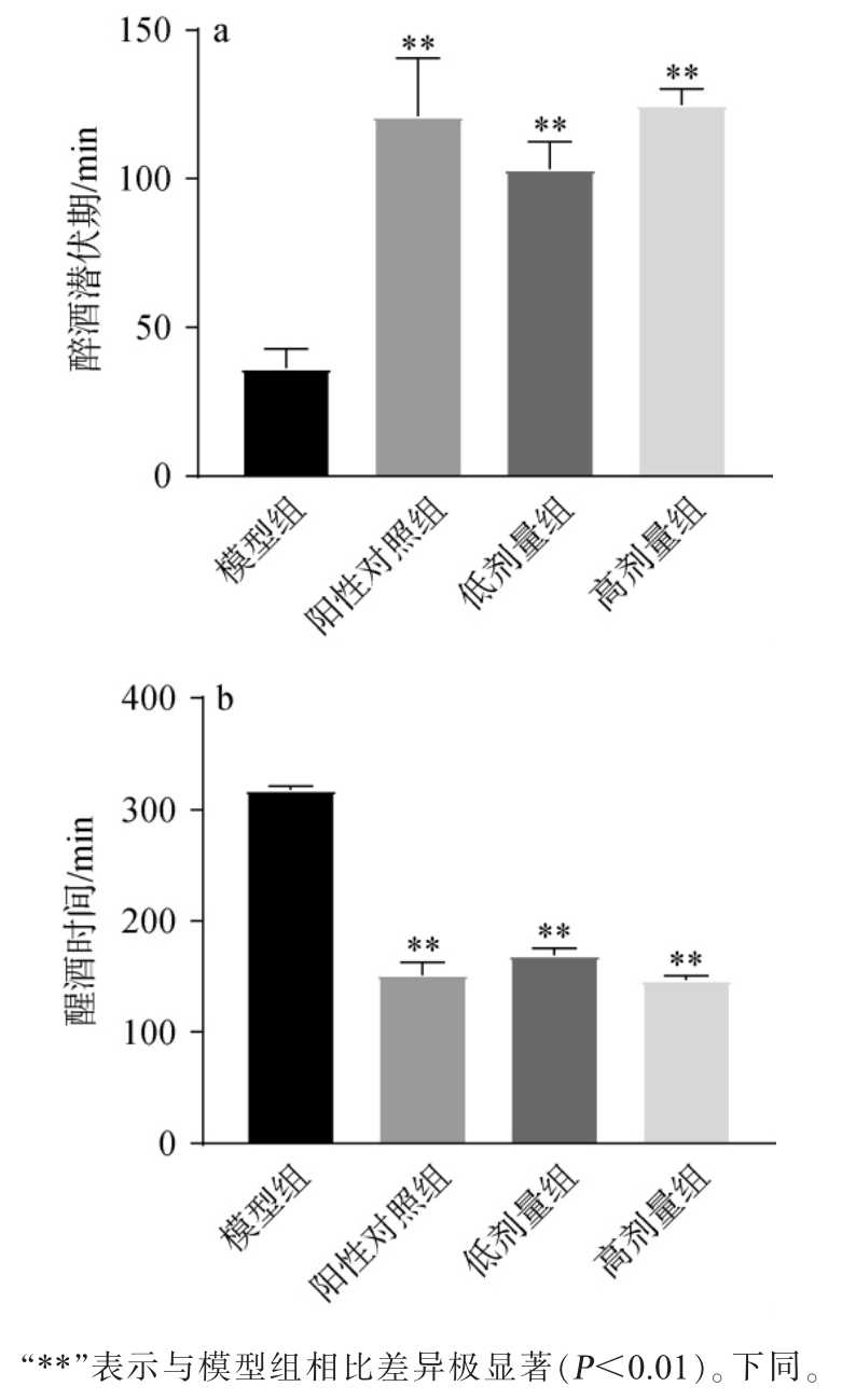 参考文献[16] 以翻正反射的消失作为判断小鼠醉酒与醒酒状态的标准。 实验开始时,小鼠被背部朝下平放在水平面上,观察其翻正反射的恢复情况。 若小鼠背部向下能够持续保持30 s以上,则认为翻正反射消失,表示小鼠处于醉酒状态;若小鼠背部向下保持时间<30 s,则认为翻正反射恢复,表明小鼠已醒酒。 醉酒潜伏期为小鼠从开始灌胃的酒例首次翻正反射消失后的30 s内无法翻身的时间,醒酒时间为从醉酒状态起,30 s内小鼠成功翻身的时间点。